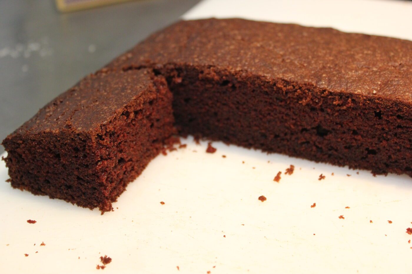 Wij hebben chioggiabieten uit onze moestuin gekookt en toen ze gaar waren gepeld en in de keukenmachine gedaan. Vervolgens deden we al draaiende de olie, stuk voor stuk de drie eieren erbij, de chocolade en de vanille. Tot het een gladde lichtbruine pap werd.