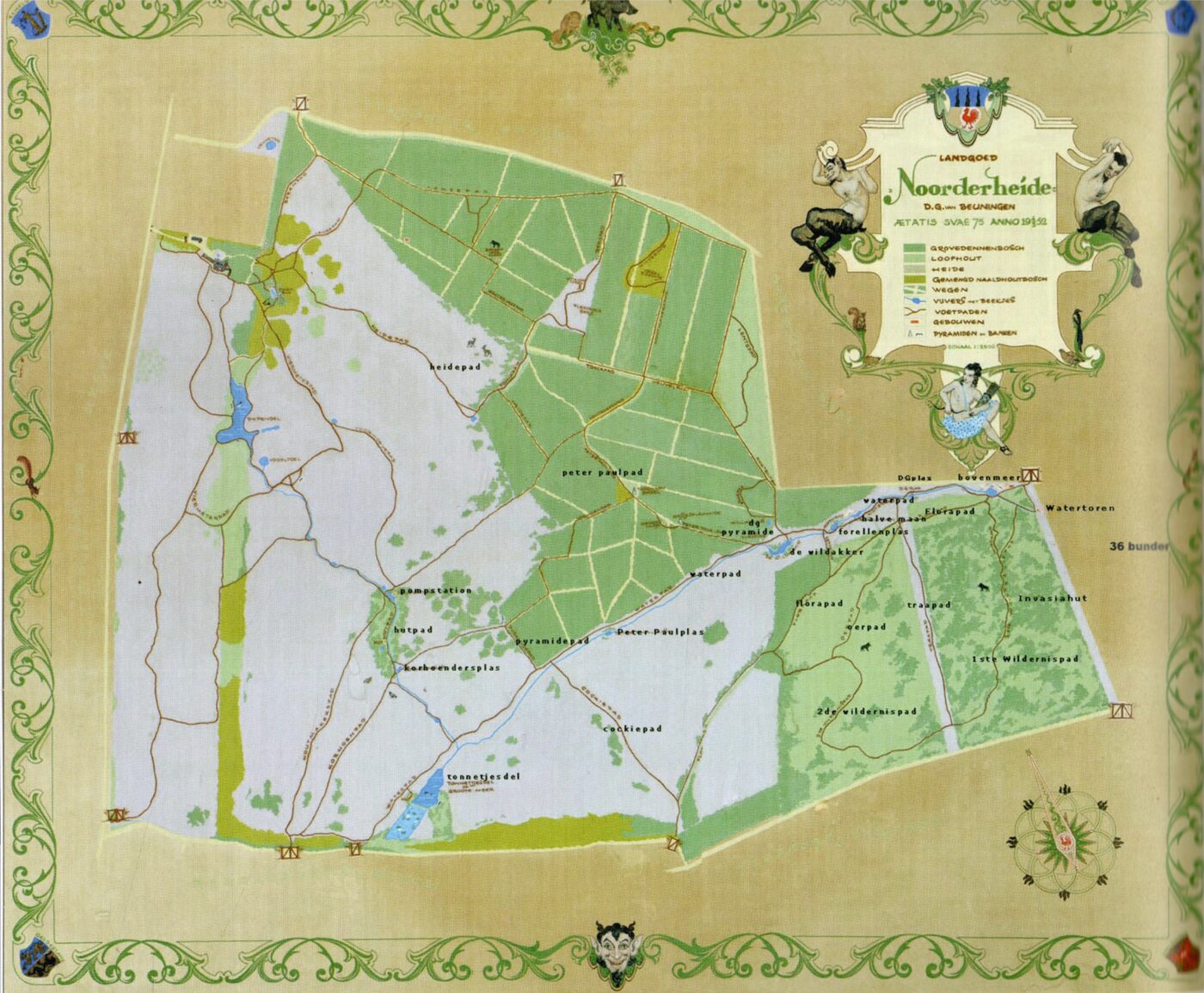 Schaafsma gaat uitgebreid in op het ontwerp van landgoed Noorderheide, bij Vierhouten. Dat ligt midden op de Veluwe. Dit landgoed was toen eigendom van Van Beuningen, in die dagen de grootste werkgever in Rotterdam. Thans nog steeds bekend door de naam van het museum Boijmans Van Beuningen. Van Beuningen vroeg Springer, maar die was de 83 levensjaren al gepasseerd en beval Voorhoeve aan. En ook bij Noorderheide spelen hoogtelijnen een rol. Voor wat betreft follies zijn er beeklopen ‘in beton gegoten’ en kleine piramides geplaatst.