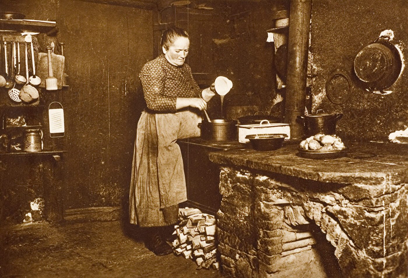 En dan is er nog de keus voor verhitten en het bakblik. Ovens (meest gemetselde) waren alleen in de keukens van de welgestelden. Open vuur, al dan niet in huis, was gangbaar. Vuur van hout (30%) en turf (70%) werd verkozen. Maar om smaakverschillen te testen, werd er gebruik gemaakt van aardewerken bakvormen, een 19e eeuwse koperen Tourtière-pot en moderne bakblikken. (Tourtière is een vleestaart, maar de koperen pot kan natuurlijk ook voor appeltaart worden gebruikt.)