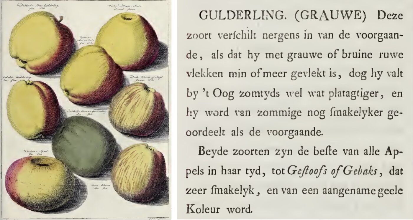 De onderzoekers merken op dat het gebruik van woorden, die de smaakbeleving en kwaliteit van een gerecht omschrijven, pas in de 19e eeuw begon. Denk dan aan ‘goed’ of ‘smakelijk’. Maar woorden die de smaak omschrijven ontbraken veelal. Hooguit in ‘zure appels’. Uitzondering lijkt Knoop te zijn, die in Pomologica (1758) voor elke appel de smaak, textuur en, indien relevant, de wijze van gebruik beschrijft. De onderzoekers vermelden de appels Grauwe en Gele Gulderling als voorbeeld. [Overigens vermelden ze in hun artikel abusievelijk de boektitel Fructologica, weliswaar ook van Knoop, maar in dat boek worden geen appelrassen beschreven, wel de vele soorten fruitbomen en struiken, MergenMetz.]