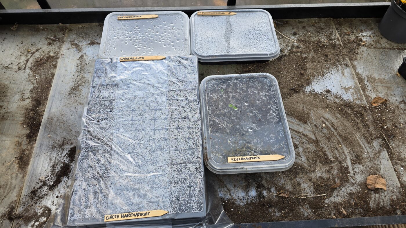 Wij hebben een aantal inheemse eetbare gewassen, zoals aardaker en echte gulden roede, gezaaid, maar ook szechuanpeper (Zanthoxylum). Het staat in bakjes in de koude kas te wachten tot de kou eroverheen gaat. Dat helpt vaak het kiemen.
