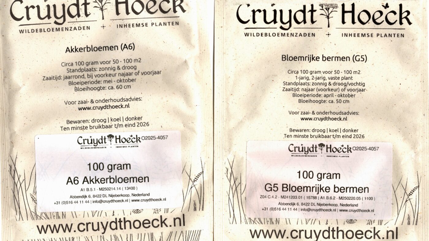 De zakken zaden hebben we gemengd en in de vier vakken uitgezaaid. Dat belooft wat in 2026: duizendblad, gewone brunel, gewone margriet, grote ratelaar, moerasrolklaver, vertakte leeuwentand, vlasbekje, bolderik, bleke en grote klaproos, gele ganzenbloem, reukloze kamille, wilde ridderspoor, Franse silene en nog veel meer.