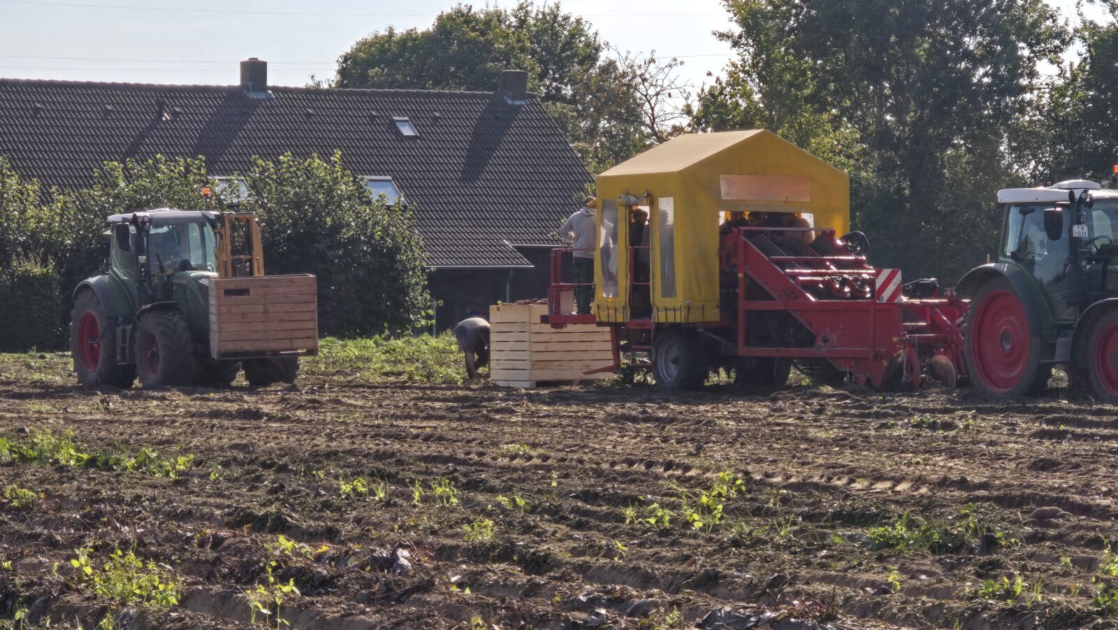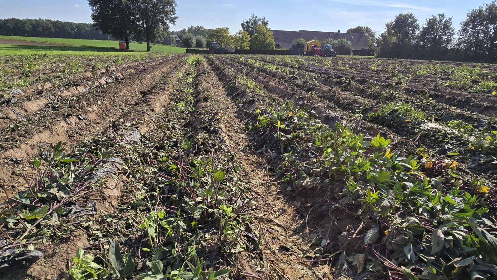 De akker blijkt al ontdaan van het loof. Dat is met de klepelmaaier gedaan, zegt Wiel. De bataten staan op aarden ruggen. We zien twee tractoren rijden. De voorste tractor trekt de speciaal gebouwde rooimachine over de rug en die hevelt de knollen in de gele tent, waar een aantal medewerkers ze grof schoont en in een krat deponeren. De trekker die volgt pikt volle kratten op en plaatst weer een lege. Erachter loopt een man die de gemiste knollen op de volgende rug legt. Die worden straks dan automatisch opgepikt.