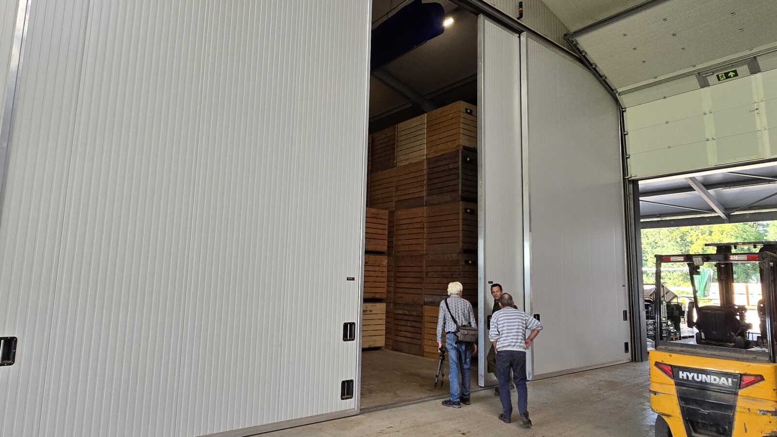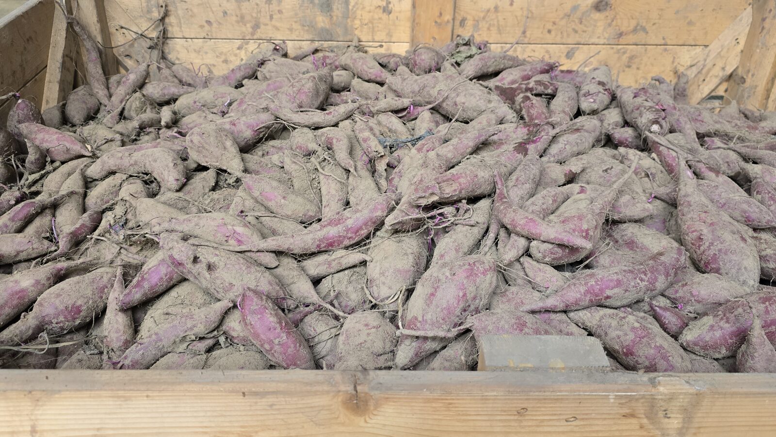 Voor we naar buiten gaan, waar wordt geoogst, lopen we langs vijf reusachtige cellen, koelruimtes. De zoete aardappelen staan vijf pallets hoog en worden bij iets boven de 10oC en hoge luchtvochtigheid bewaard. Dat kan makkelijk tot een jaar of langer, zien we. Hier ligt maar liefst 500.000 kg biologisch geteelde zoete aardappel opgeslagen. (En er worden momenteel cellen bijgebouwd met ongeveer dezelfde capaciteit. Of die louter met bataten worden gevuld, zijn we vergeten te vragen.) Maar voordat ze de koele cel in gaan, ondergaan ze een zogenaamde curing: ze ondergaan een week een warmtebehandeling bij 29oC.