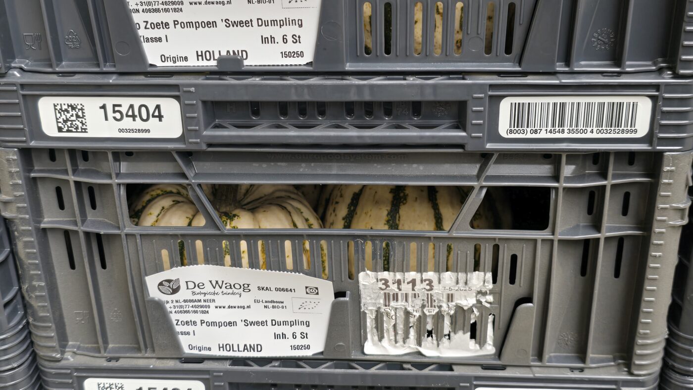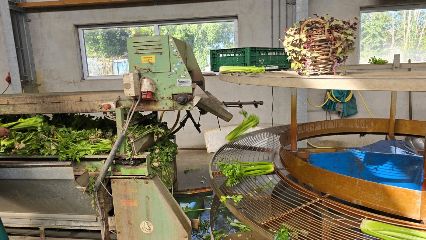 En bij De Waog telen ze ook diverse pompoenen. We zien in de grote hal veel kratten met crown prince en nog meer kratten met de kleine mooie sweet dumpling.  En we zien hoe de geoogste groenselderij wordt geschoond en verpakt.