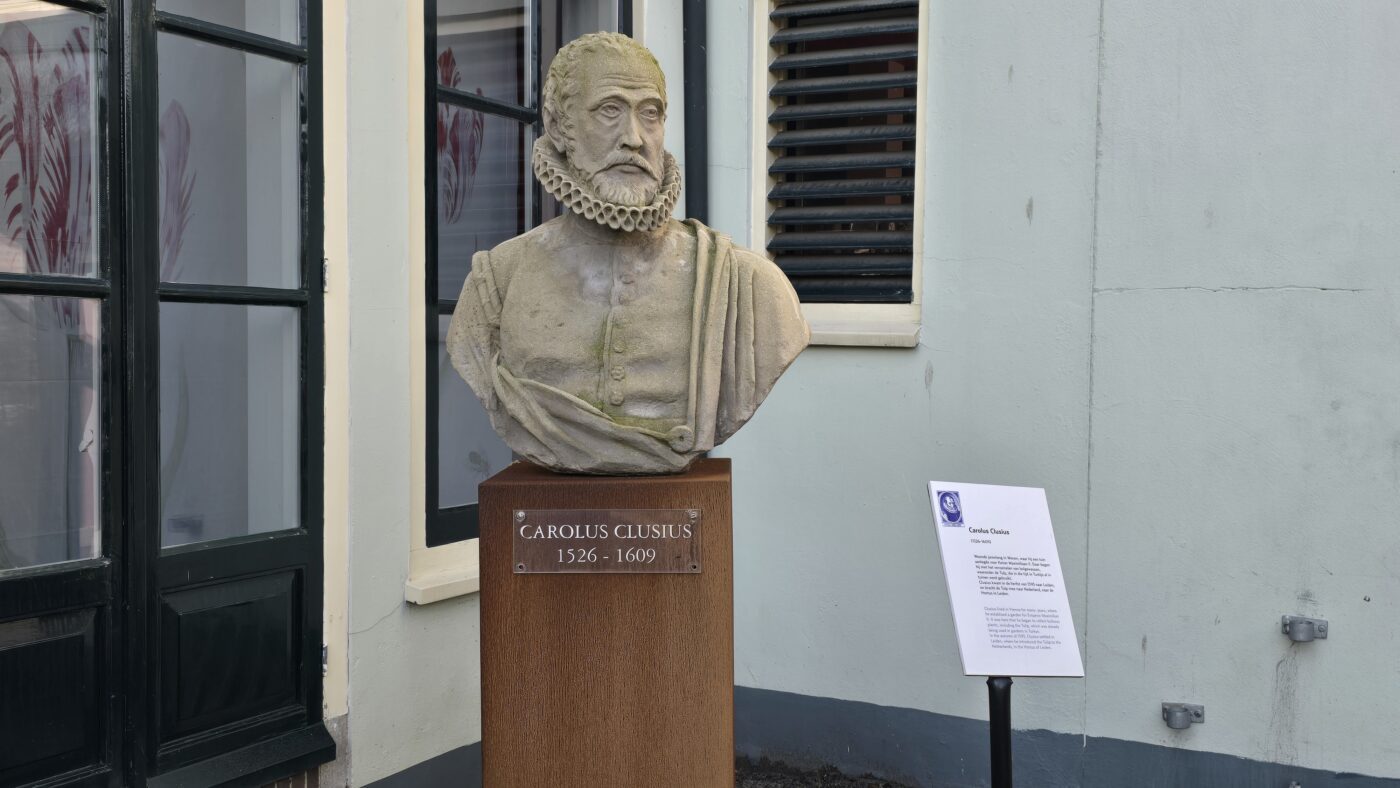 Nog voor de entree van het museum ontmoeten we een borstbeeld van Clusius. De man die de eerste tulp naar Leiden bracht en daar in de hortus plantte. Of beter: liet planten. Het waren de laatste jaren van Clusius en hij was niet meer erg mobiel. Doch hij was zonder het te weten de aanstichter van de tulpenteelt in Nederland. En de tulpenmanie. Dat mocht hij echter niet meer meemaken, hij stierf in 1609.