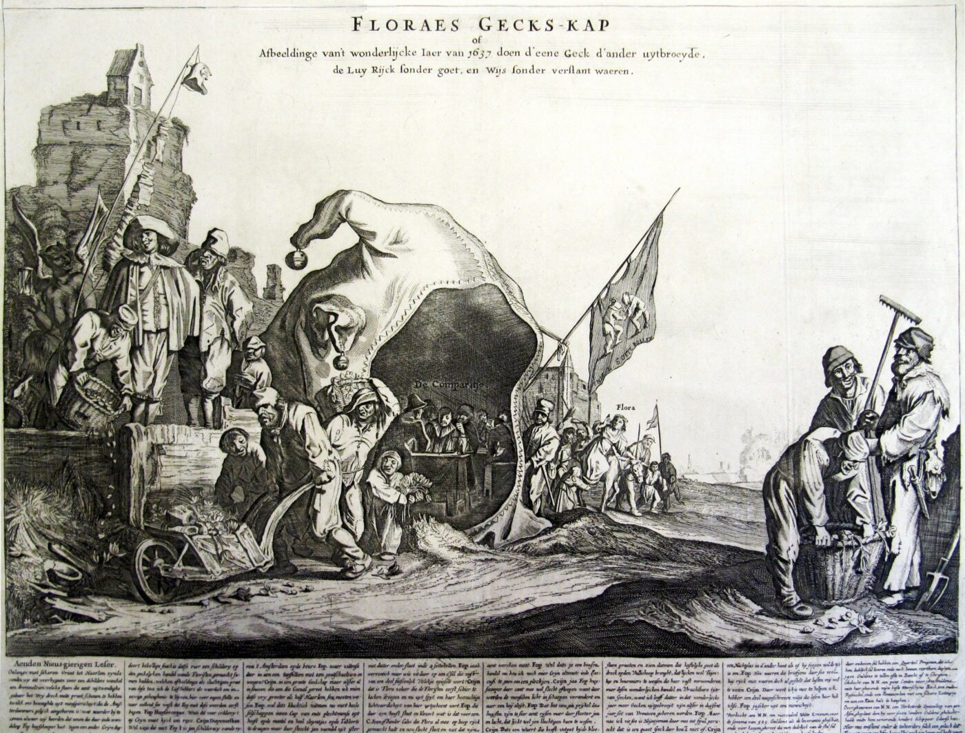 Het boek De Zwarte Tulp, van Dumas (ook bekend als auteur van De Drie Musketiers), kwam in 1850 uit, de tulpenmanie was 1636-1637, het duurde korter dan de huidige belangstelling voor de bitcoin en andere cryptomunten. In beide gevallen gaat het om een economische bubbel, gecreëerd door mensen die door speculeren snel rijk willen worden. In het museum hangt een spotprent uit 1650. In het midden van de prent wordt in een herberg handel gedreven. De herberg heeft de vorm van een narrenkap: toentertijd het symbool voor dwaasheid. Links zien we de duivel met een zandloper. Rechts de godin Flora, die op een ezel wordt weggejaagd door boeren.