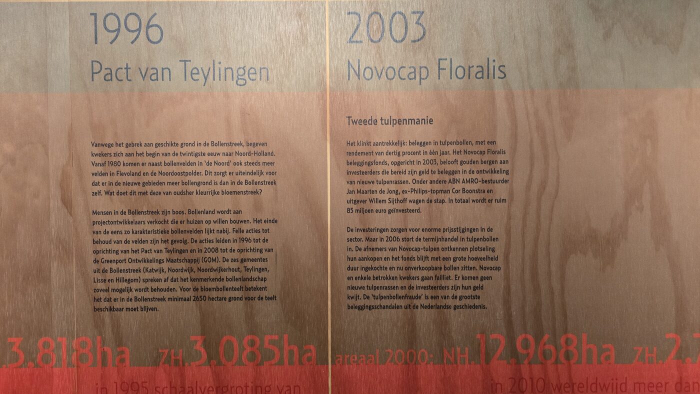 Links lopen we langs een soort van tijdsbalk met memorabele jaren en personen, fraaie tulpenkunstwerken en rechts staan de gebruiksvoorwerpen van de bij bloembollenteelt en handel.