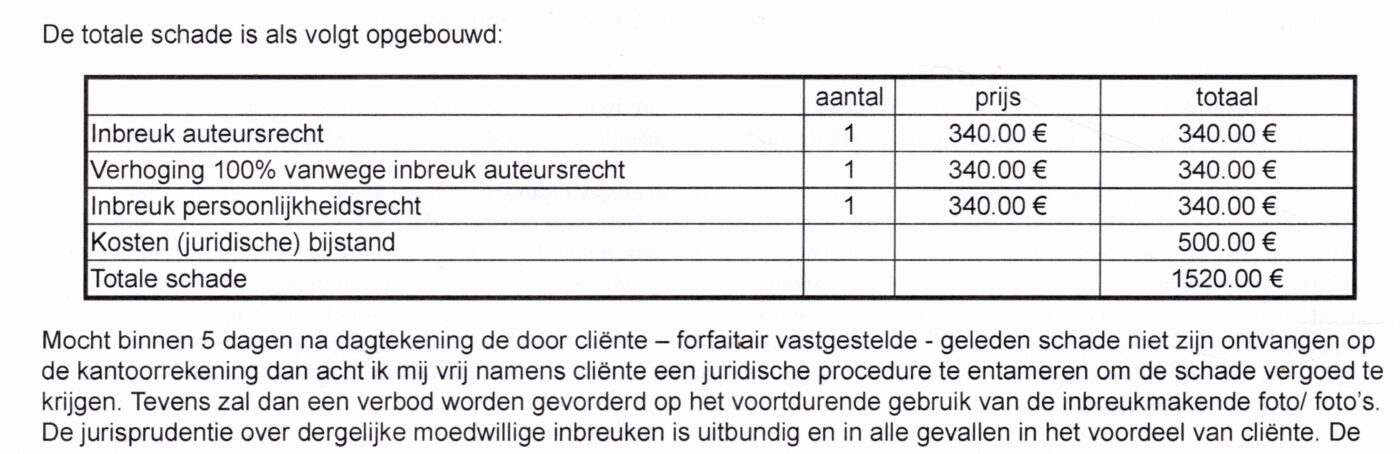 Met inbreuk persoonlijkheidsrecht doelt men er wellicht op dat de naam van de fotograaf niet was vermeld. Kosten (juridische) bijstand is twijfelachtig. Het is voor hen immers routinewerk: copy & paste.