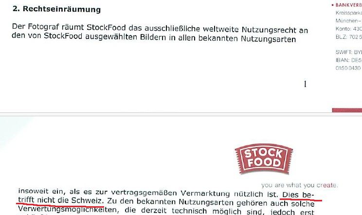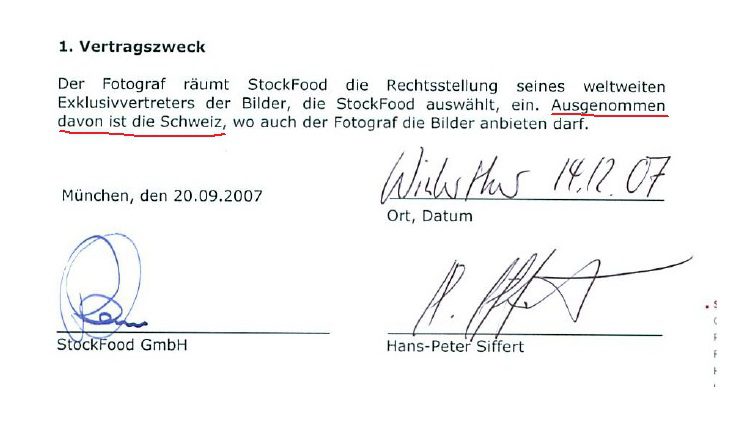 We beheersen de Duitse taal behoorlijk en zien twee interessante passages in het contract tussen de fotograaf en Stockfood: