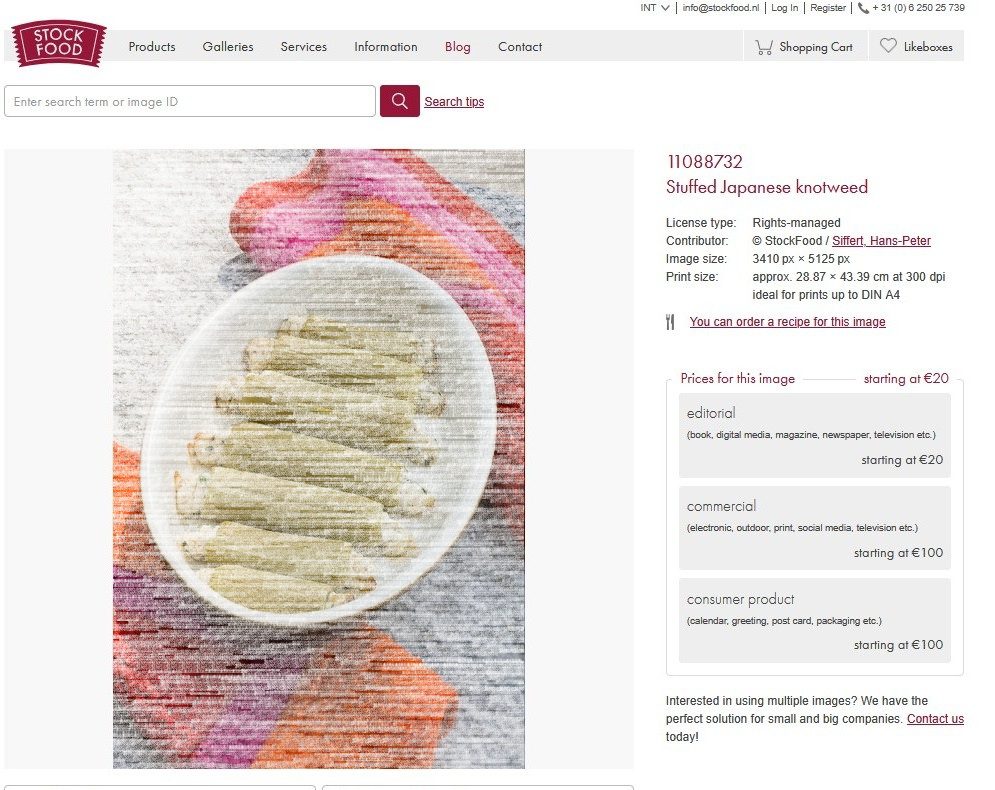 Het betreft een claim voor het gebruik van een foto, meer dan tien jaar geleden. Het is een foto van gevulde stelen van de Japanse Duizendknoop in een schaal. Deze staat bij een recept in het boek Meine Wilde Pflanzenküche, van Meret Bisseger. Een Duitstalig Zwitsers boek, dat we ooit recenseerden.