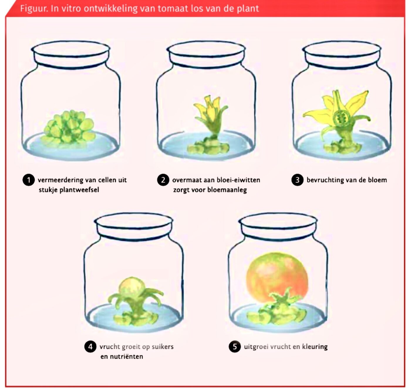 Zo is Lucas van der Zee van de WUR bezig om die tomaten te telen zonder plant. Op een kunstmatig medium met voedingsstoffen en hormonen kweekt hij uit een bloemknopje direct een tomaat, zonder de ballast van wortels, stengels, bladeren en allerlei vervelende ziektes. Volgens Van der Zee zou deze productiemethode zelfs op een duurzame wijze kunnen bijdragen aan voedseltekorten als gevolg van klimaatproblemen, zo stelt hij in een artikel op 2 januari in de NRC. Lees hier ook zijn verhaal in het vakblad Onder Glas, of download het artikel in Trends in Biotechnology (PDF) of hier de publicatie van Universiteit Utrecht.