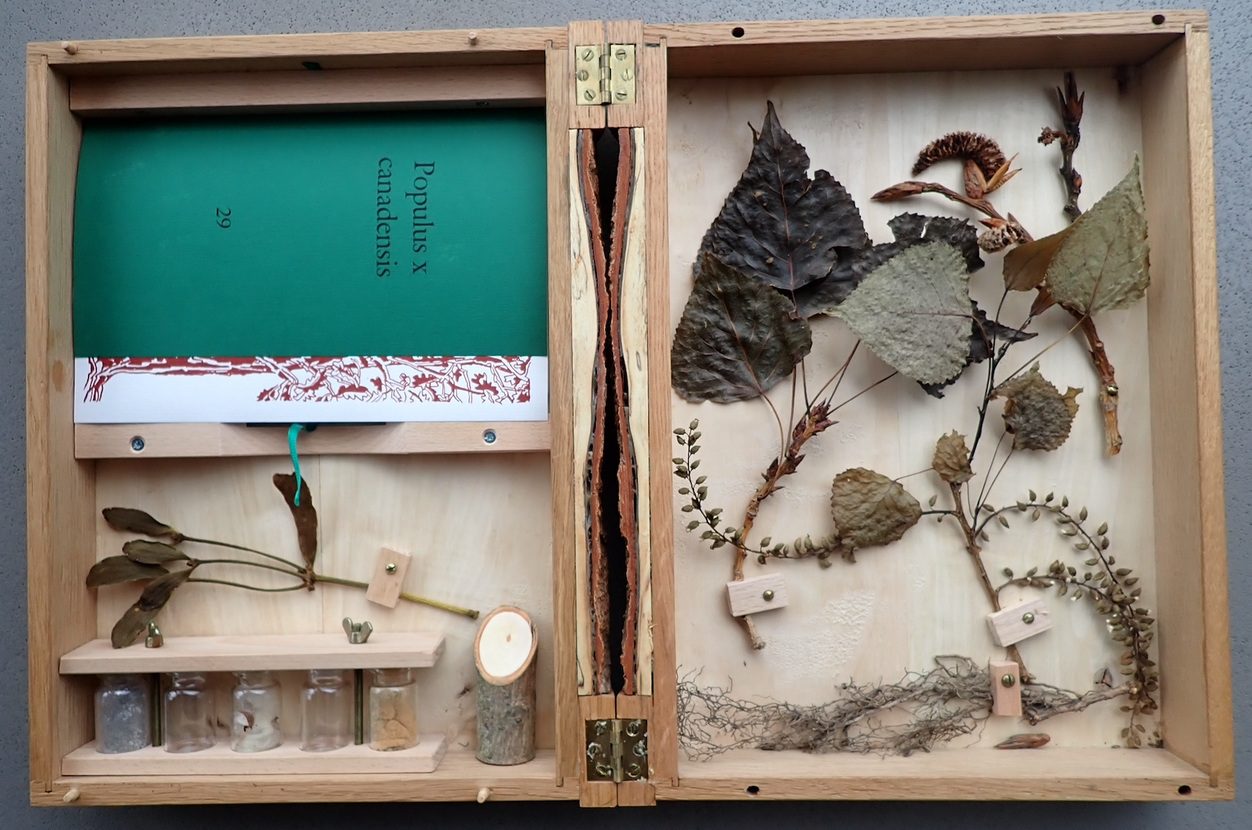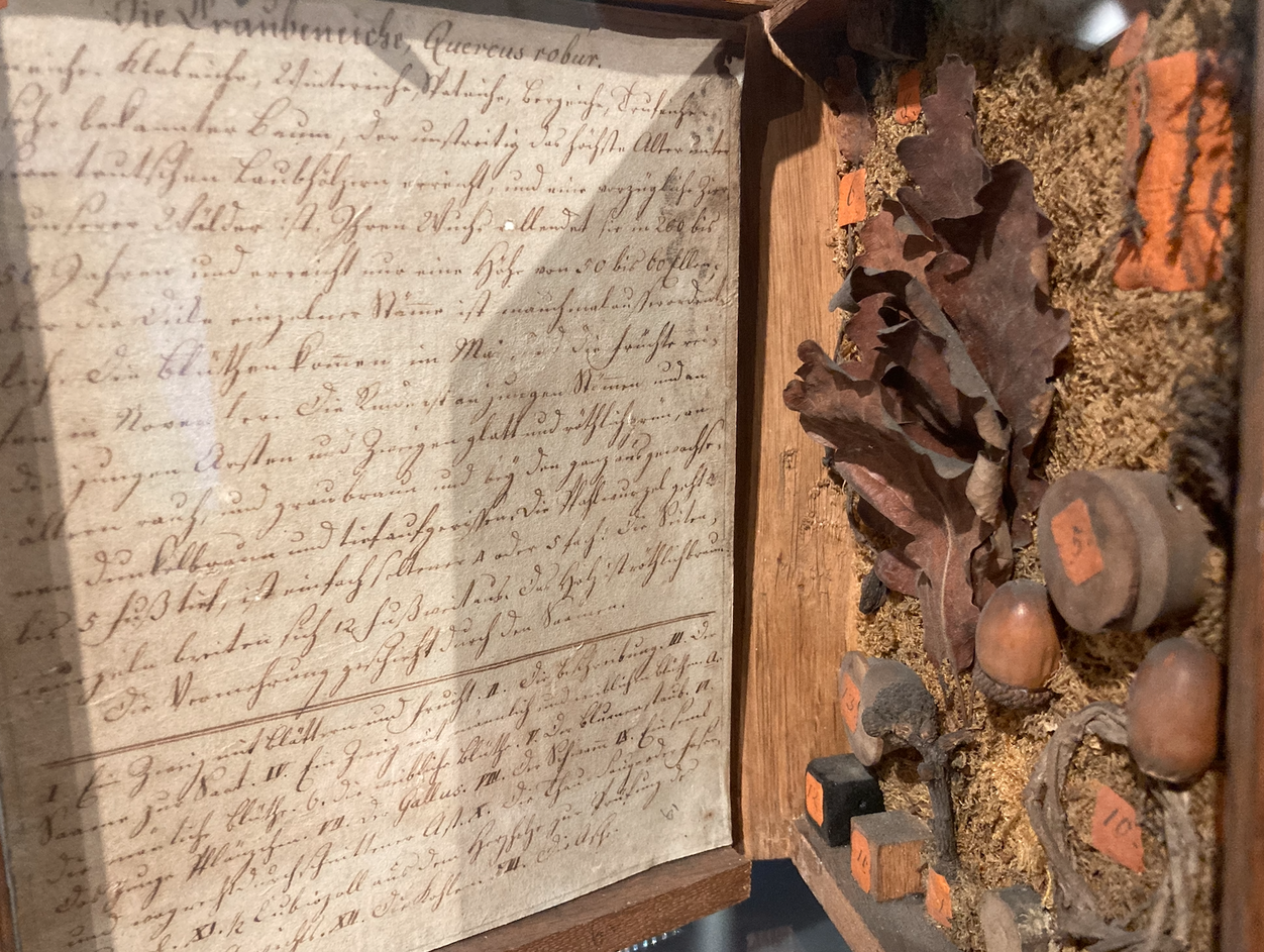 Op de rechter ‘pagina’ liggen op een bedje van mos eikenbladeren, eikels, takjes, een onvolgroeide eikel aan een takje, dwarsdoorsnedes van stukjes eikentak, een blokje eikenhout, een verkoold blokje eikenhout en een piepklein houten potje met daarin eikenbloesemstuifmeel. Op de linker bladzijde heeft Schlümbach in Gotisch-Duits handschrift onder de kop Quercus robur een hele verhandeling over de zomereik geschreven. En zo staan er in de kast nóg eens 146 boeken, telkens over en gemaakt van en met één boomsoort.