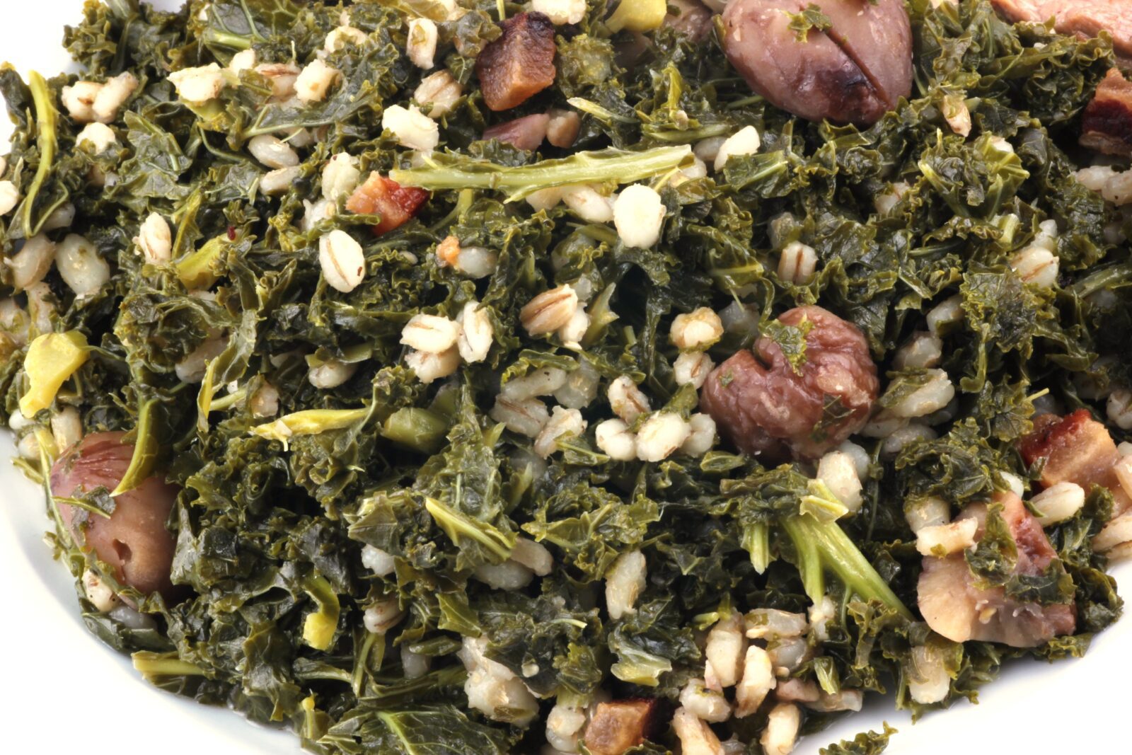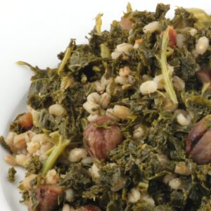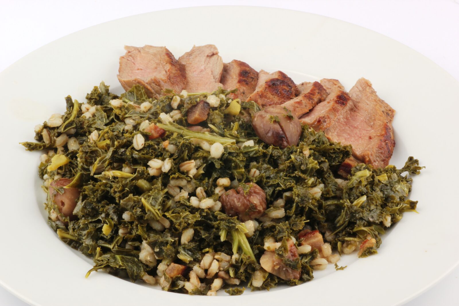 Op zoek naar een andere manier van boerenkool bereiden, vonden we al dit moderne recept van boerenkool met gort, maar ook diverse verwijzingen naar dit choux paysanne (Boere-Kool) recept van Vincent La Chapelle. We hebben het een heel klein beetje aangepast, zie daarvoor de opmerkingen.