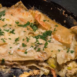 Een bijzondere lasagne met prei een een bechamelsaus. Gemaakt in een gietijzeren koekenpan en de gerookte kaas geeft er een bijzonder smakelijk tintje aan.