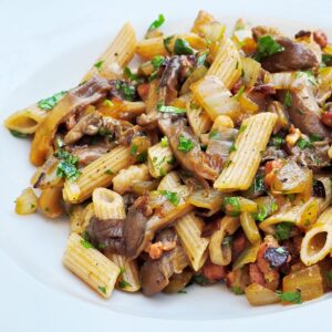 Als de pasta gaar is (vermoedelijk na 8 minuten koken), afgieten en door de oesterzwammen mengen.