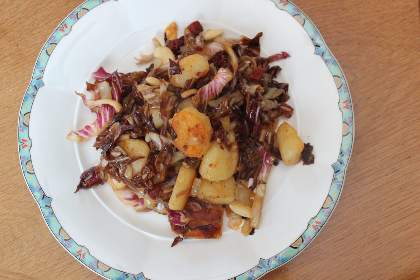 Er waren van zondag nog wat aardappels over en radicchio. Op ons aanrecht staat altijd het boek Smaakvrienden van Angélique Schmeinck. Het enige kookboek dat er is, want het inspireert tot nieuwe gerechten en wel met datgene dat je al in huis hebt.