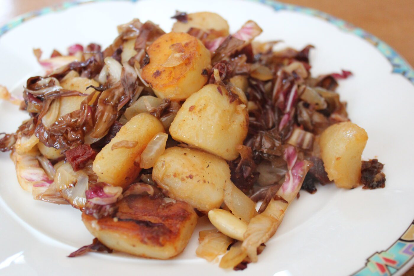 Eenvoudige maar o zo smakelijk roerbakgerecht van radicchio (roodlof) met aardappelen en heuse Hongaarse salami.