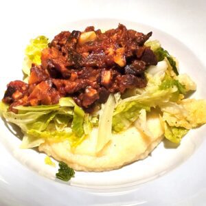 Een even verrassend als smakelijk gerecht. Savooiekool op een laagje polenta. En daarbovenop een dikke paddenstoelensaus.