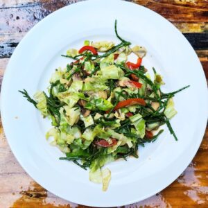 Zeekraal is lekker. Spitskool is lekker, de combinatie is nog lekkerder en dan nog met wat champignons en paprika. Serveer met rijst of bulgur. En als je geen vegetariër bent: met gerookte makreel of een moot kabeljauw.