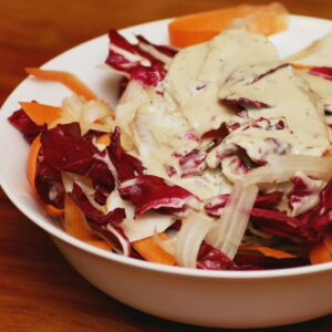 Heerlijke salade van radicchio met in dunne linten gesneden wortel , bleekselderij en aardpeer. Daarover een gave dressing van rozemarijn in melk ingekookt en gepureerde ansjovisjes.