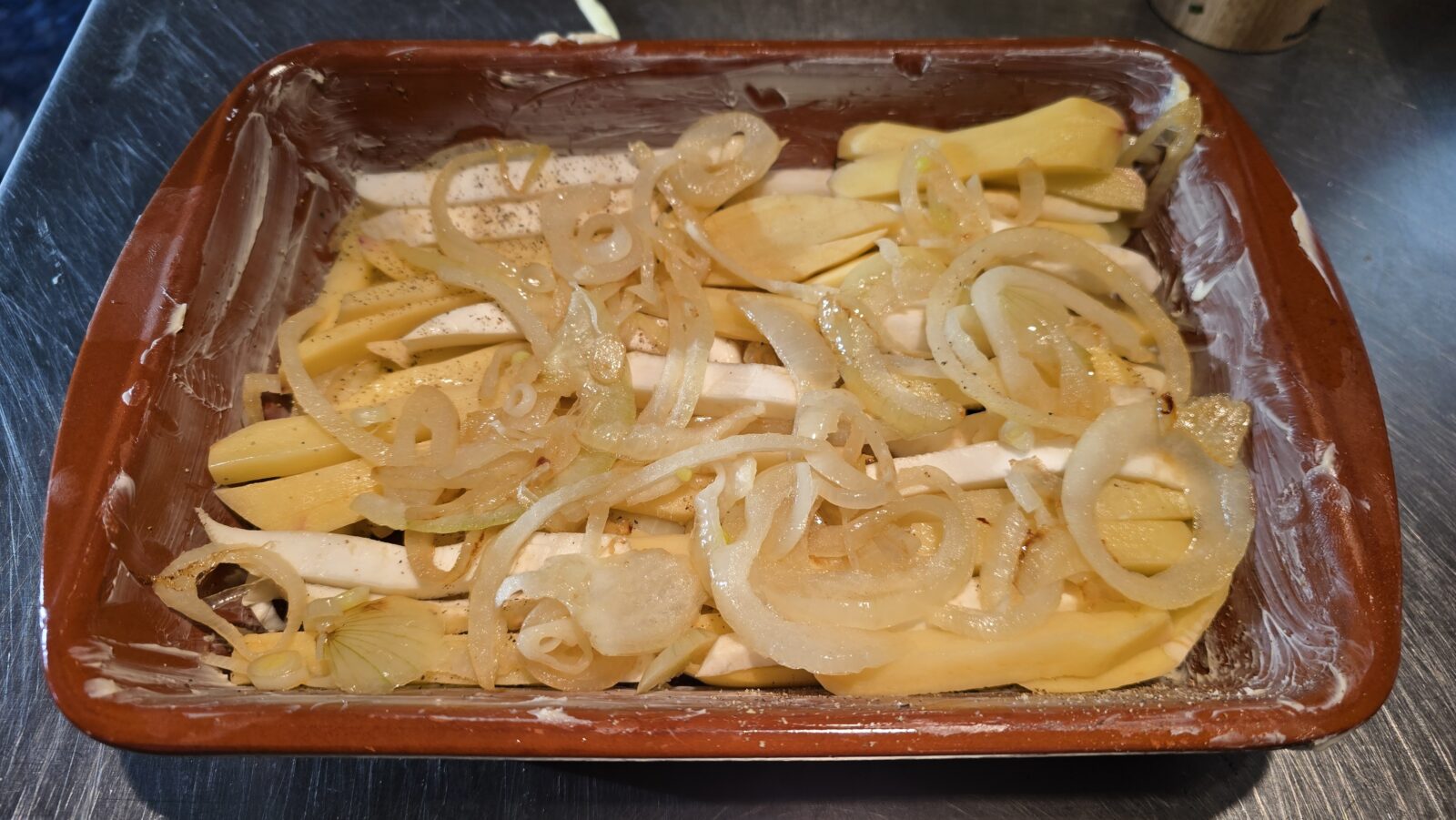 Vet een ovenschaal in met de rest van de boter (of ghee) en leg ui, aardappel- en knolselderijfrieten in laagjes erin. Tussen elk laagje wat peper uit de molen. De schaal mag niet nokkie-vol worden.
