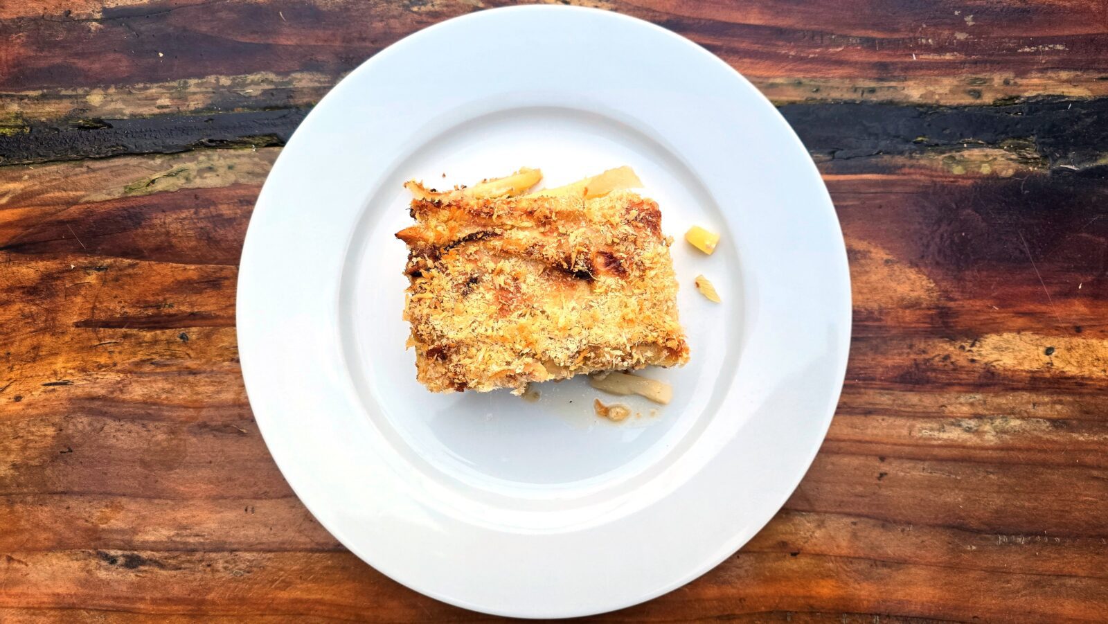 Deze ovenschotel is met knolselderij, aardappel en een saus met ansjovis heel smakelijk. Het is er eentje die mag blijven, smaakvol en ook goed in moten over de borden te verdelen.