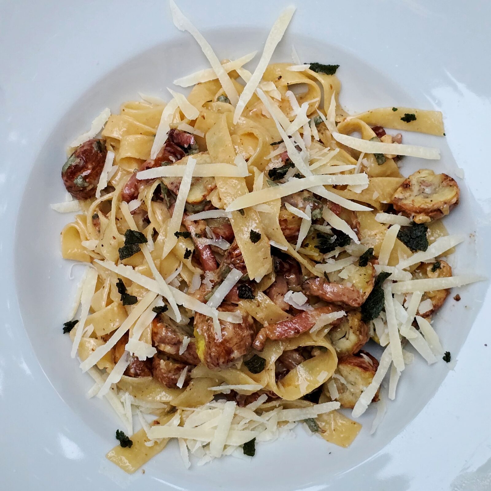 Pasta met tamme kastanjes? Dat kan. Dit is een uiterst simpel en zeer smakelijk recept voor tagliatelle of een andere langdradige pasta met spek, salie en tamme kastanjes.