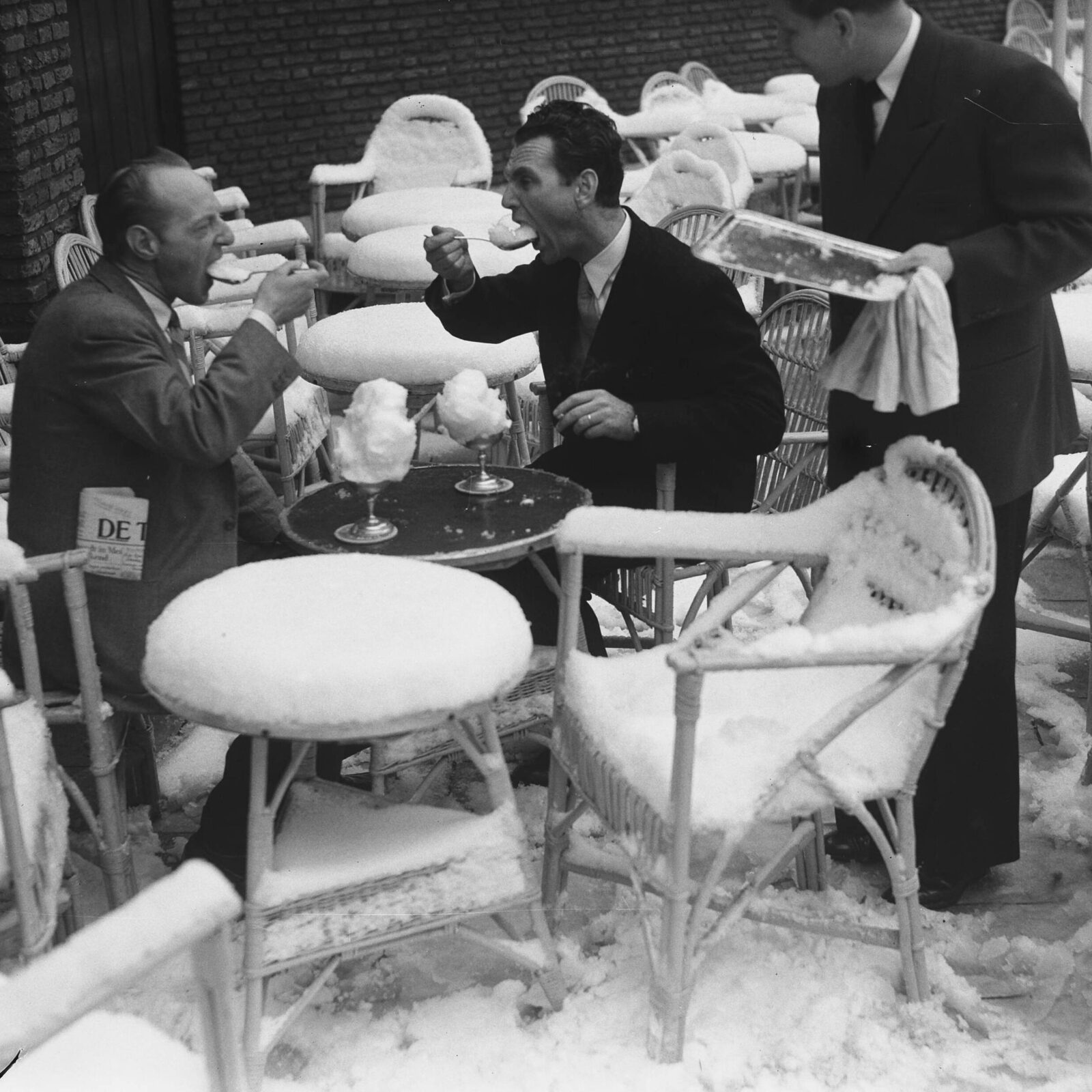 De foto van twee in de sneeuw tafelende heren komt uit het Nationaal Fotoarchief. (Wij zitten gewoon binnen te dineren, in de serre van De Pelshoeve.) De foto’s zijn o.a. balkenbrij, blaarkop, Hedelfinger kers, Boeren Leyden Traditioneel kaas, Amsterdamse ossenworst met uitjes, Bloemendaalse Gele kool, Sint-Jansui, rolpens, Soesterknol, Vlaardingse ijzerkoekjes, Goudse boeren oplegkaas, Deventer zwartblad (biet), beekridder, krombekbonen, appel bloemeezoet.