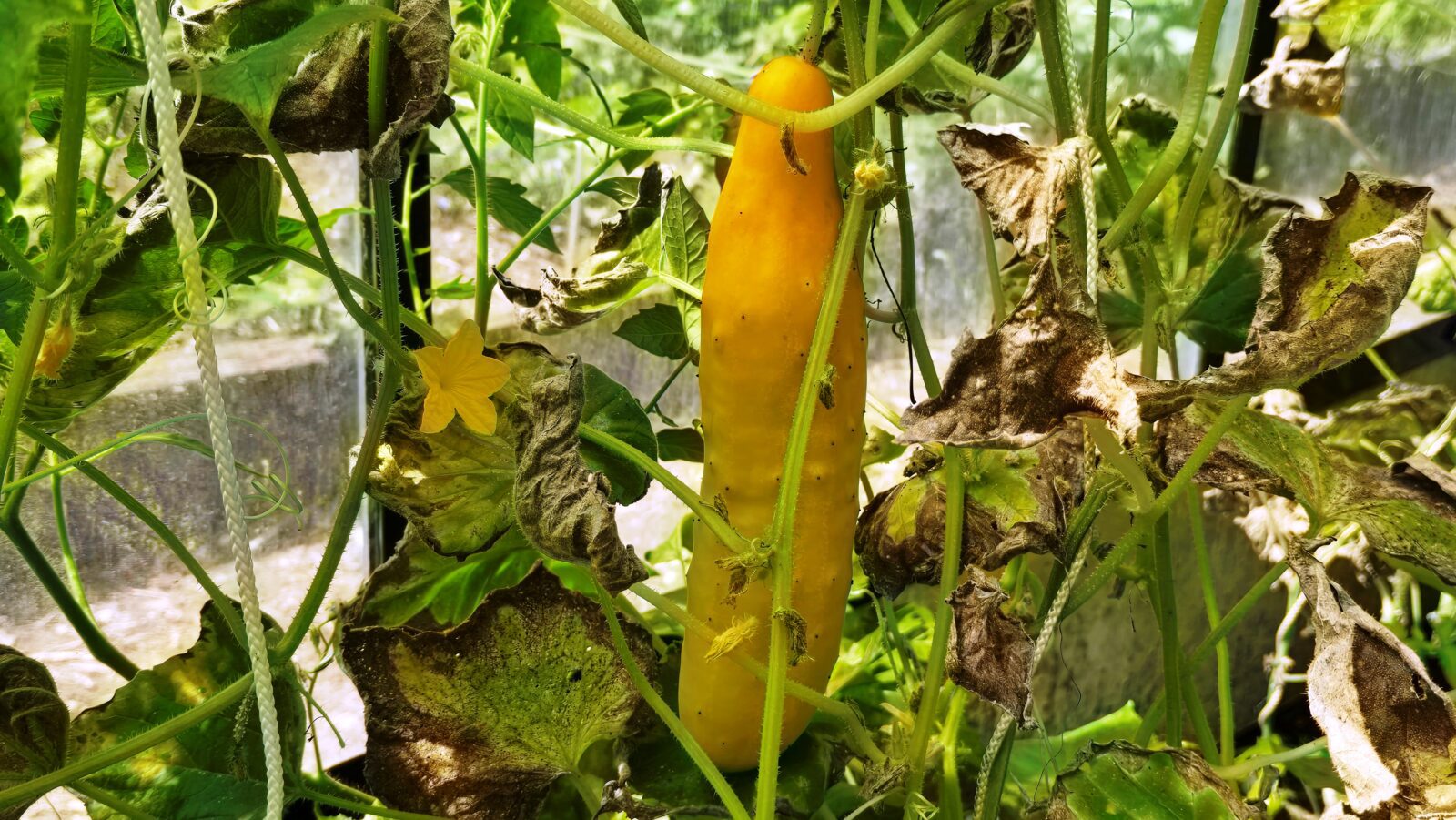 Hij draagt vruchten van circa 40 cm lang. Het is een ouderwetse komkommer, dus er zit een zaadlijst middenin. Maar die hindert niet. De smaak is uitstekend, zelfs een beetje naar het zoete toe. Vers geplukt is ze, in tegenstelling tot wat wordt gezegd, niet bitter. Met dien verstande: alle oudere komkommerrassen kunnen bitter worden als ze lijden door tekort aan water of grote hitte. Dat gebeurt af en toe.