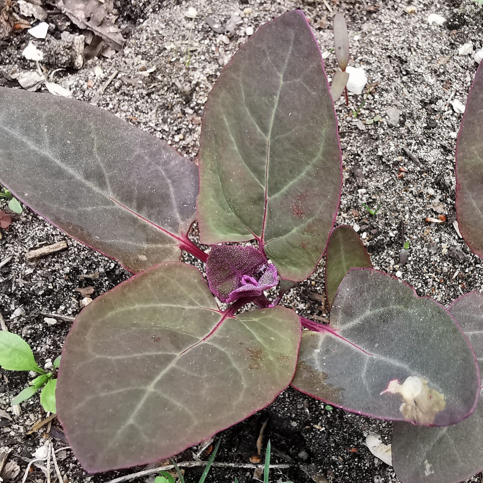 Desalniettemin wordt het nog door hobbyisten, zoals wij, geteeld. Uit de tuin en hoppa, in de pan. Dit is de rode melde, bruin-rood blad, tegen paars aan.